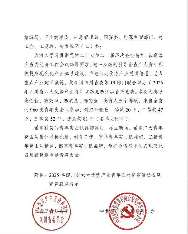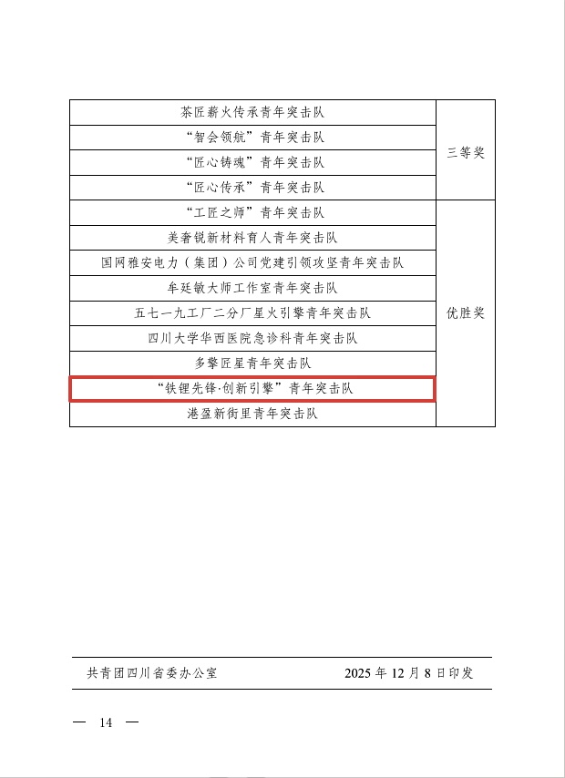 近日,由共青团四川省委等19个部门联合举办的2025年四川省六大优势产业青年立功竞赛圆满落幕。本次竞赛面向全省“15+N”重点产业领域的中央企业、国有企业、高校及新兴领域青年突击队,共吸引960支队伍参赛,设置“赛创新、赛效率、赛质量、赛安全、赛育人”五大赛项。伟德国际1946bv官网“铁锂先锋,创新引擎”青年突击队凭借在磷酸铁锂正极材料研发领域的突出成效,荣获“赛育人”赛道优胜奖。