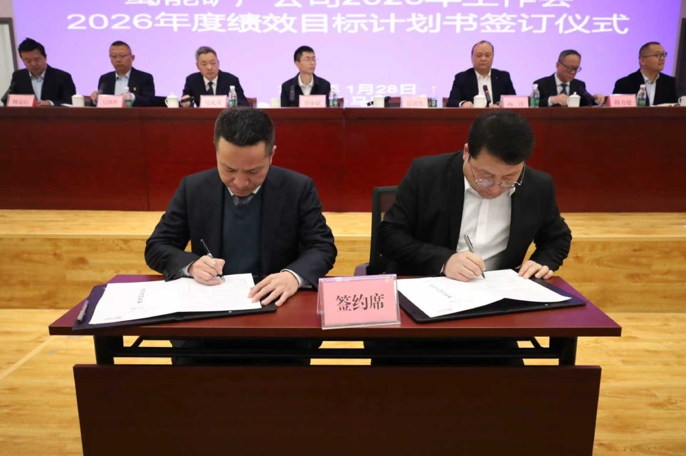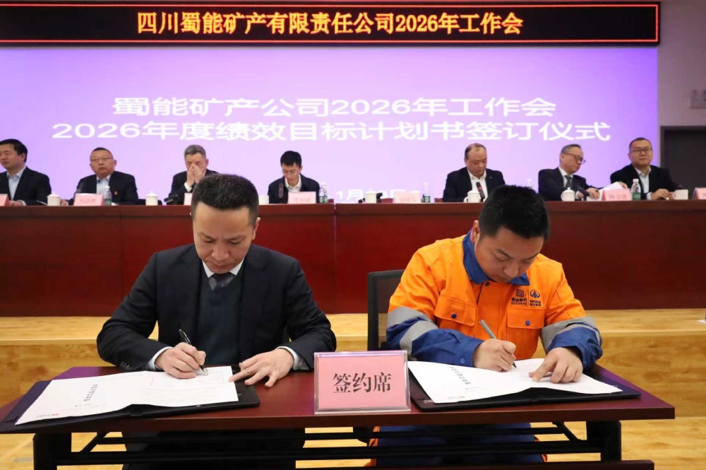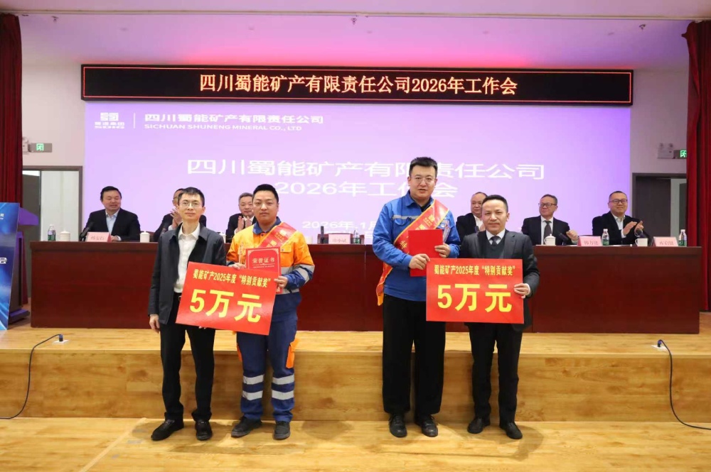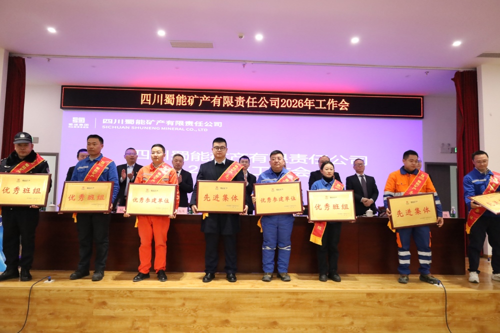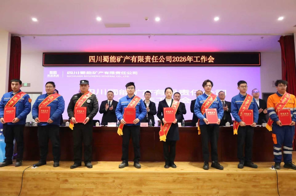 公司党总支副书记、纪律检查委员、工会主席(候选人)杨洋主持会议。党总支委员、副总经理韩方建,副总经理杨安臣分别传达了蜀道集团、蜀道矿业集团2026年工作会精神,党总支委员、副总经理万洪胜宣读2025年度评优评先表彰决定。徐开贵分别与三号矿山矿长郭龙、磷酸铁锂厂总经理盖仲宽签订2026年度目标责任书和安全环保目标责任书。出席会议的领导共同为获奖集体和个人代表颁奖。