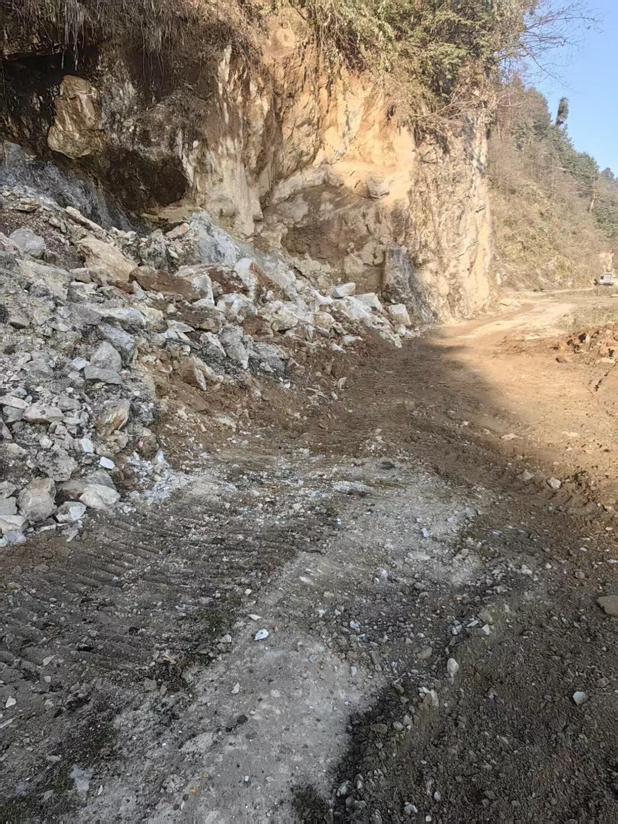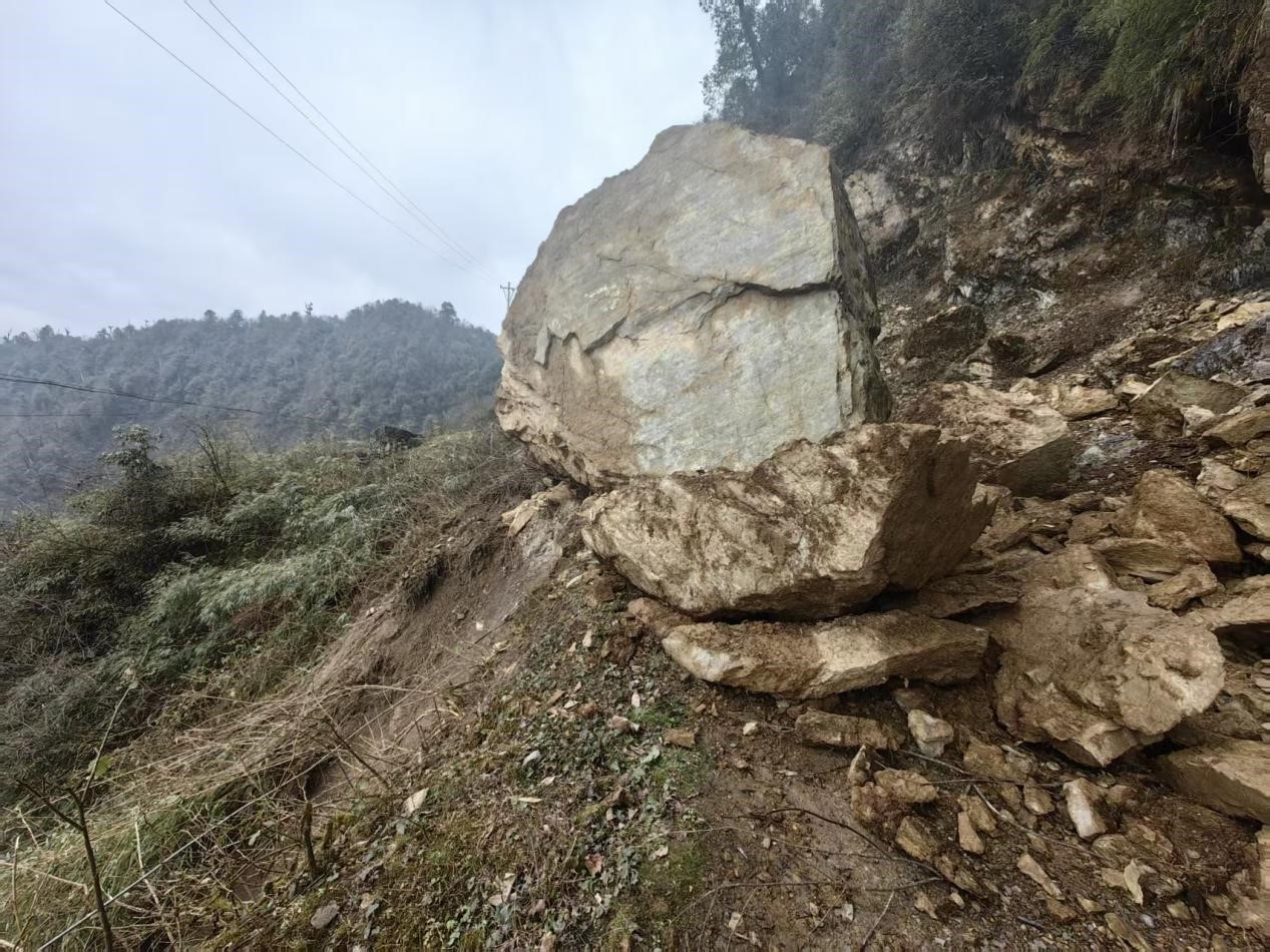 2月19日(农历正月初三),三号矿山值班人员在日常巡查中发现通往大风顶自然保护区门口约200米处道路旁存在一处大型危岩风险隐患,三号矿山生产副矿长支小龙、安全副矿长唐太平迅速组织值班值守的专业技术人员进行现场勘察,查明该危岩系大风顶自然保护区道路边坡失稳后滚落形成,体积约125立方米、重约300余吨,危岩一侧凌空搁置于公路边沿,受降雨、融雪或外力干扰极易滑移倾覆,对下游村民、过往行人及三号矿山1645工业场地构成严重威胁。